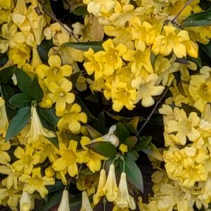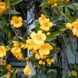 あちこちでカロライナジャスミンが咲き出して華やかです 同じジャスミンでもハゴロモジャスミンとは異種のようですね
