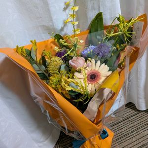10/23主人が退職しました。 職場の方に恵まれて楽しくお仕事させていただいた上に、会社からと同じ施設の方達から素敵な💐をいただいて帰ってきました。(退職する男性用の💐って黄色やオレンジ系になるんですね。テーマカラーが同じ💐、お花もガーベラ、バラ、ピンクッション…と似ていますが、ショップは違いました) 他にもお菓子やお餞別のお品を色々頂いて晴れやかな顔で帰ってきました。 再就職をする予定ですが、まだ決まっていなくてちょっと弱気になっていましたが、この日ばかりは上機嫌、この後、お疲れ様でしたということで夕食はお寿司屋さんに行き、幸せな締めくくりの一日に😊