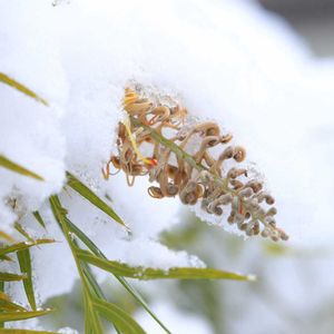 雪から顔出すグレビレアの花は珍しくないですか? この数週間寒かったのでピーチ&クリームの色が褪せた感じになっています。 この積雪でこの花はこれ以上開花は進まないのではないかと思われます。 その後について 咲いていた花は雪の翌々日見ると全て枯れてました。 地植えで、かなりわいるとに暴走して育ってしまったので今年は不織布巻くすべもなく…花は残念ですが木は元気そうです。