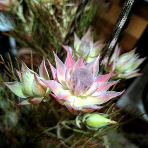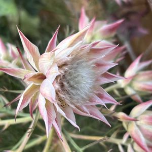 セルリア プリーティピンクは 南アフリカ原産で ヤマモガシ科のお花です。 頬を染めた花嫁(blushing bride)の別名もあり 故ダイアナ妃のブライダル ブーケにも使われたそうです…。 ピンク色の尖っている部分は 葉っぱが変化した総苞で 中心部の花は フワフワ モフモフとした毛が生えていて とても珍しい花姿です。 -3℃位迄であれば 越冬が可能なようですが 鉢植えで室内で育てるのがいいようです。🤗 南アフリカ原産。 ヤマモガシ科プロテア属の半耐寒性常緑低木。