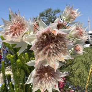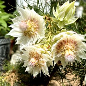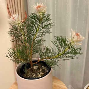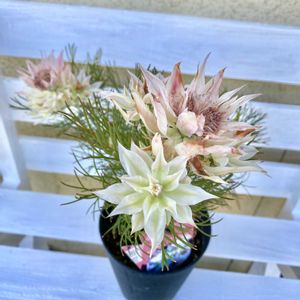 藤まつりの近くの花屋さんが 売り出しって知って寄って見ました オージープランツがたくさん売ってました ①中でも立派なキングプロテア ②豪華なセルリア ③もりもりのバラ咲きのペチュニア ④いろいろのもりもりペチュニア このブライダルベールの一輪が ペチュニアより大きい😳 私は見ただけ 相方は野菜苗🫑