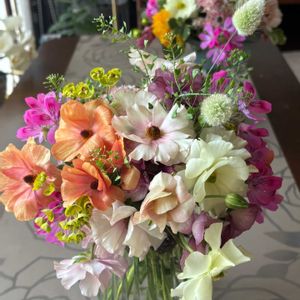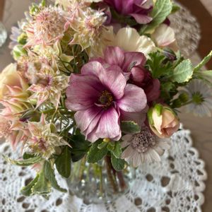今日の花遊び教室は、 ①②午前中にはブーケを ③④午後は鳥の巣アレンジを楽しみました。 ⑤今週は、ラナンキュラスラックスが満開になってきたので、ミニブーケのお土産付き💐でした