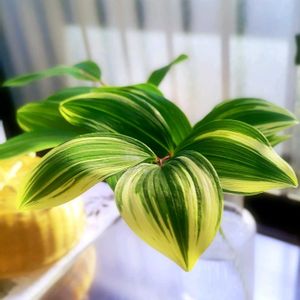 キッチンの出窓に 射し込む朝日のパワーが強くなったと感じた朝 今日も初夏の陽気になりそう アマドコロの斑入り葉が清々しい