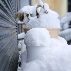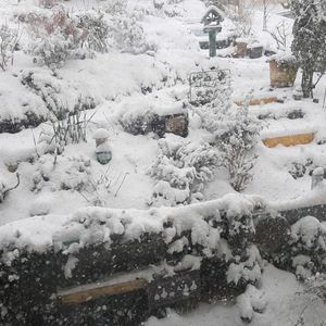 雨戸を開けたら 壁ぎわでも えぇ感じの形に積もった鉢植え🍧 中はチェッカーベリーが埋もれてます😅 …豪雪地帯の皆さま お怪我がありませんように🙏