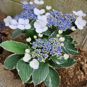 斑入りアジサイ「恋路の浜」 斑入りに弱い私… 一目惚れでお迎えしました🩵 狭~い北側玄関横に植えて 明るさを出したいと思います✨✨