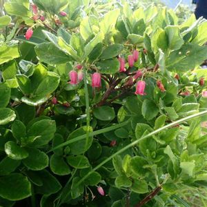垂れ下がった花柄の上にポチッと 膨らむこの芽は◦◦◦◦◦ ツツジ科ドウダンツツジ属の落葉低木または小高木。 深山の林や岩場に生える。 別名、フウリンツツジ。 花や葉はドウダンツツジよりも大きい。 🩷サラサドウダンツツジ😻 枝先に長さ2 - 3 cmの総状花序をつけ、10個ほどの花が1 - 2 cmの花柄の先端に垂れ下がってつく。 萼は鐘形で4分の1ほどまで5裂する。花冠は長さ8 - 10 mm、 ベル形で先端は浅く5裂する。 花冠の色は、淡黄色で先端が淡紅色になり、紅色の縦条が入る。 雄蕊は10本ある。 果実は蒴果で上向きにつき、5片に裂けて種子を飛ばす。 冬芽は赤褐色をした卵形で長さ6 - 10 mmほどあり、細毛がある5 - 8枚の芽鱗に包まれている。葉痕は扁平な半円形で、維管束痕が1個つく。