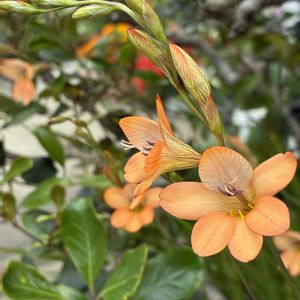 我が家の小さな庭&鉢植え〜🧡🤍🌿 1️⃣2️⃣3️⃣ 〜トリトニア〜🧡 球根植物 庭のあちこちに…毎年必ず咲きます🎶 蕾が多くて、順に咲くのでビン挿しも長持ちします😘 4️⃣5️⃣ 〜シャリンバイ(車輪梅)〜🪴 バラ科 常緑低木 主人がいつの間にか挿し木していたコ😆 冬の間もずっーと葉っぱだけで背丈70cmのスレンダーさん🌿 今春、初めて花咲きました〜🙌 公園や街路樹の間の植栽も咲き始めていますネ🤍🌿 梅のような可愛いお花🤍🌿 我が家はこのまま鉢植えか🤔 実家畑にお嫁に出そうか😆