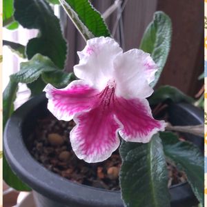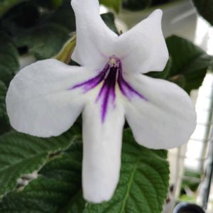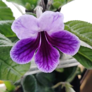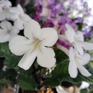 ストレプトカーパス種まきっ子 No.8 白に濃い矢羽根風紫が素敵 開花数日後花弁が後ろに丸まったところがいいね! ②は開花途中のNo.9と一緒に ギザギザの花弁故か開花に時間が掛かってます。
