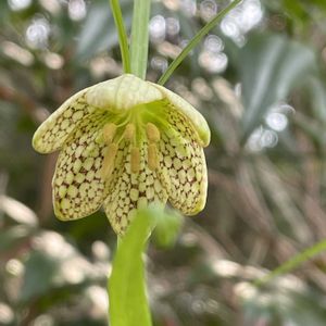 ボタニカルなバイモの花 釣鐘状で下向きに咲き 上下に揺れる姿が 美しい
