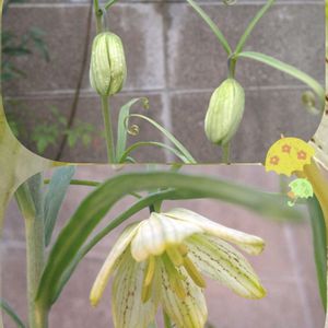 山梨県南東部自宅の庭にて撮影しました。知識が無く、草なのか花なのか?もわかりません。教えていただけますか?よろしくお願いいたします。→GSの大先輩ひささんに「バイモユリ」と教えていただきました。 ありがとうございました。