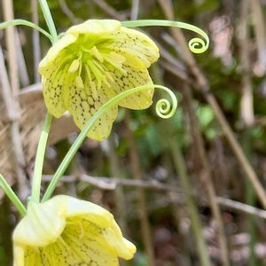 バイモ(貝母) ユリ科バイモ属の半つる性多年草 別名 アミガサユリ(編笠百合) バイモユリ(貝母百合) 葉の先が、巻きひげ状に、くるんとカールしていて、モジャモジャしている草姿です。 ① 3月下旬に咲いていた花に、若い実がついていました。 ② 絡まる相手がそばにいなくて、おひとり様の株もありました。 でも、来年は、仲間が増えて、 絡まり合えるかもしれません😆 ③④ 土手に咲く花の様子