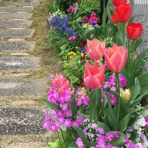 こんにちは😊 今日は日中、グングン気温が上がってます!22度予報 今日のお花「サクラソウ」 ❶10年前の「サクラソウ」と「チューリップ」の寄せ植え 分かりにくいですが手前は寄せ植え奥は花壇のチューリップ🌷 ❷昨年秋に寄せ植えした「プリムラマラコイダス(サクラソウ科)」と「チューリップ」 寄せ集めのチューリップなので高さがバラバラだー