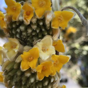 『強靭』『肉親の絆』。「強靭」は、上質な和紙や紙幣の原料になる強い繊維質の樹皮に由来します。「肉親の絆」は、三つに分かれた枝が、父・母・子を連想させることにちなみます。小花が寄り添ってくす玉のように見える、香りも楽しめる花です。
