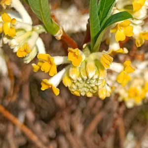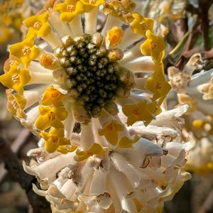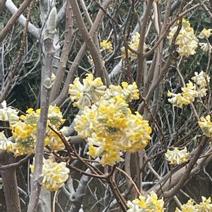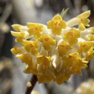 初めて入ったお菓子屋さんの小さな庭にGSで見たことのあるミツマタの花が😀 1度は見たかった花でした😄 こんな町の中で見る事が出来て嬉しいかったです😀 まだ枯れていない花を見つけて撮りました🤗