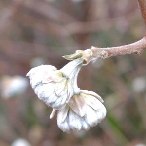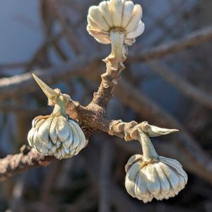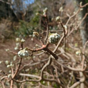 ミツマタ ジンチョウゲ科ミツマタ属 落葉低木 中国中南部、ヒマラヤ地方原産 花期3〜5月 三つ叉に分かれた枝の先に黄色い花を咲かせる。 葉が出る前に、花が球状に集まった黄色の頭花を、枝先に付けて下向きに咲かせ、甘い芳香を放つ。 開花はまだ先のようですが、蕾の状態でも白い花が咲いているように見えました。 1年枝の樹皮は和紙や紙幣の原料として用いられている。