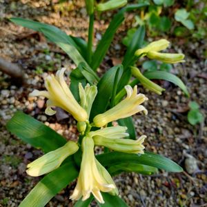 今日の花 ヒヤシンス ①②何年も地植えのヒヤシンスは年々花数少なくなってます。 ③〜⑤🌱が出てムクムク開き始めたムサシアブミ