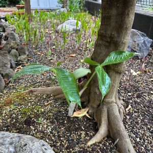 ムサシアブミ (サトイモ科) 花は肉穂花序で仏炎苞と呼ばれる大きな苞の中に包まれていて、見えないようです。 仏炎苞と呼ばれるのは、形が仏像の背後にある仏炎に似ていることから。 大船フラワーセンターにて撮影📷