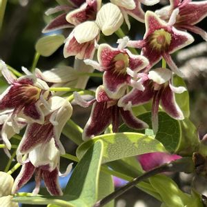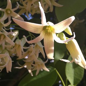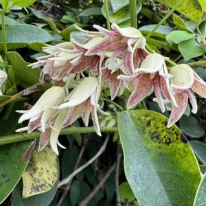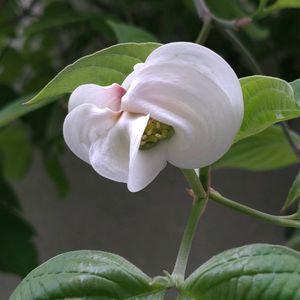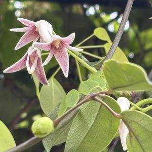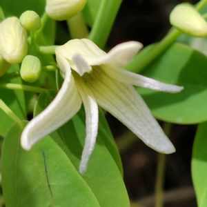『愛嬌』。ムベの果実が、口を閉じて、可愛らしく笑ったように見えることが由来といわれています。花期は4~5月です。
