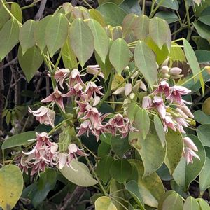ムベ。別名トキワアケビ。 アケビの仲間でも、花は全く違う形なのですね。 花がいっぱいでした。