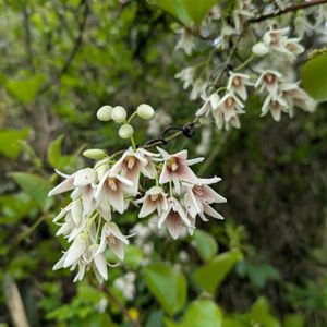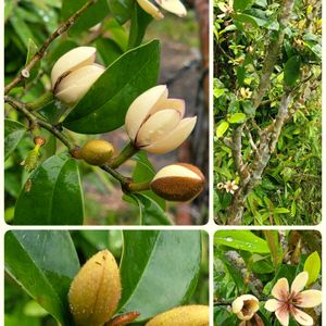 💧雨の中💧no.3 散歩中、珍しい木、雑草、見つけました! 始めてみるお花も……あった! 1️⃣カラタネオガタマ 始めての木です! 変わった固そうな蕾はうぶ毛がついて固そう~ お花も変わってみえました! 2️⃣ムベの花 別名 トキワアケビ 3️⃣クシキノマンネングサ 小さな星型な黄色い花 4️⃣コガクウツギ アジサイによく似た花 5️⃣斑入りイタドリ 別名 スカンポ 2026.4.22.📸pic!