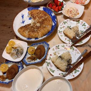 夕ご飯 パエリヤお焦げ有 牡蠣、サフラン、バター、 チキンプィヨン 生の牡蠣、大根おろし、ゆず、醤油 (私は生は苦手で夫のみ) 豆乳、出来立て 大根千切 とカニカマのマヨ辛子醤油サラダ コロッケ、大根おろし、ゆず 苺