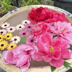 花のお寺で知られる小浜の多田寺へボタンのお花を観に行ってきました🌺 1・2 色とりどりの傘と牡丹が素敵 3 本堂へと上る階段脇にはツツジが咲き始めていました 4 本堂から鐘楼を望んで 5 手水にはボタンのお花が浮かべられていました✨