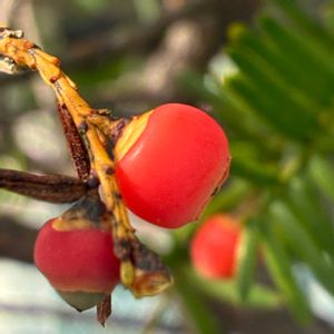 旅先で見つけたイチイ🔴🌿 ②最初に見たのは車窓から〜 ③葉っぱの形が特徴の常緑針葉🌿 ④出かけるところ至る所で見かけ〜 ⑤①居酒屋の帰りに〜見ーっけ👀✨ ようやく心のモヤモヤ〜がスッキリ💖