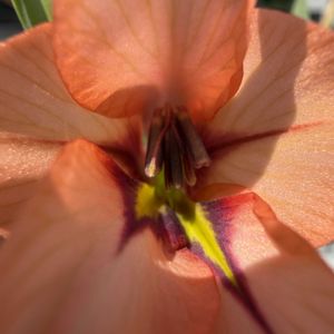 Gladiolus meliusculus咲きました 大好きなグラジオラスで、輝くペールオレンジ🍊の花弁に、ブロッチが鮮血🩸+ネオンライムライト🍋🟩 良い香りもするし抽水性ケープバルブだしおもしれーってなるグラジオラスです。 アラタスグループなので、アラタスに似ていますね