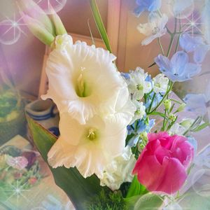🩶🌩❄️おはようございます 2月7日土曜日🪐︎︎𓂃⟡.· 気温急降下 ⤵︎ ⤵︎ ⤵︎ 風がゴーゴー荒れ模様 (ノ*>∀<)ノ♡🎵〜🍃😖💦 暖かくして過ごしてね 🧣🧤💭 きのうスーパーのお花コーナーで 💐『推しのブーケ』って言っちゃてる花束見つけました、😍 ⸜🌷︎⸝ チュウリップ 🧊 デルフィニウム 🤍ྀི グラジオラス お部屋は春みたいです😉✌️💕 今日も良い一日であります様に…
