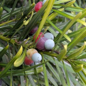ここ(豊橋)にやって来て イヌマキの生け垣が多いのに関心を持ちました その矢先 イヌマキの果実が話題になっていて 是非見てみたいと探し始めました ところが生け垣は雄花(の残骸?)らしきものがついていて どうも雄株が多いようです⑤ ちなみにイヌマキは雌雄異株 ところが!手入れをしていない野生状態になった株をみつけ観察したところ 見つかりました!! 見つかりました!🤣 ①双子の果実(花床が一つ 種子が二つ)もありました! ②③花床は白色→黄色→赤色→暗赤色と変化し熟していきます 種子は緑白色で粉を吹くような変化です ④暗赤色の花床を種子からねじり取り味見すると なかなか美味しい! 甘い柔らかなゼリーのようで 皮も実と同じように柔らか また食べたくなります! ただし種子は有毒とのこと! なおGSで話題になっていた胎生型を示す樹上での発芽は見つかりませんでした