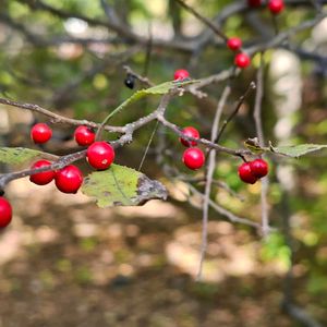 2025.10-11 豊橋にしばらく滞在したおりに 豊橋のんほいパークの植物園を見学しました 季節がらか花は少なく もっぱら樹木を見て回りました 赤い実をつける木本がいくつかありました これはウメモドキです モチノキ科モチノキ属 モチノキ科の植物は ソヨゴやクロガネモチのようにほとんどが常緑樹ですがと これは落葉樹なんです 雌雄異株で雌株は秋に美しい実をつけて楽しませてくれます(1,2枚目) 樹皮は灰褐色 株立ちになることが多いそうです(3,4枚目) まだ幼木ですね