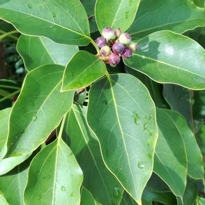 カクレミノ(隠蓑) ウコギ科カクレミノ属 常緑広葉樹 小高木 在来種 天狗が持つ、着ると姿が消える「隠れ蓑」に葉を見立てたのが和名の由来。 雌雄両全性、又は両性雄花同株。 若木の葉は3〜5裂するが成本では切り込みが無い事が多い。 我が家の直ぐ近くに在るカクレミノ、 存在に気付いた時には3裂の葉がいかにも天狗の隠れ蓑を思わせたが、今はほぼ裂の無い葉っぱばかり。 実を付けないとカクレミノとは思えない。 昔は夏に樹皮を傷つけ白い樹液を取りこれを塗料として使った、「黄漆」という (三河の植物観察より抜粋引用) 昔は樹木は地球温暖化防止(CO₂吸収、酸素供給)以外に生活の中に活かされていたのだと思います。