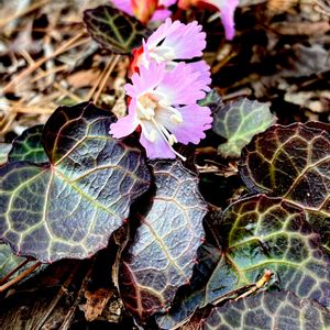 咲き始めでした❣️ イワウチワ(岩団扇) 別名 コイワウチワ *イワウメ科イワウチワ属 花期は3〜4月 中国地方以北の山林や林縁に自生する常緑多年草! 花は赤い花柄に2〜3cmで横向きに咲く! フリフリに切れ込みの入った花弁は5枚に見えますが、基部で繋がっています! 雄蕊は5個.基部に仮雄蕊! 葉は革質で厚く長い柄が特徴で葉脈が薄く目立つ! 葉の基部は心形! (特に葉が魅力的) ④向かいあって! ⑤蕾だと萼片がよくわかります! (萼片5枚.苞片1-3枚) 岩地に生え葉が団扇に似ることからの名前ですが、岩場で無くとも咲きます! (北斜面に多いようです) 絶滅危惧種を指定している都道府県も多い! 3月22日撮影 宮城県 伊具郡