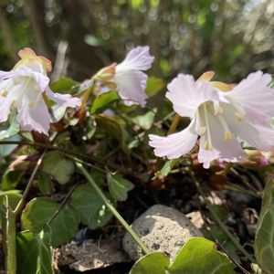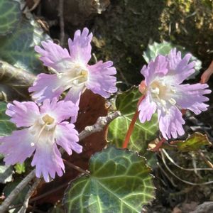 小石川植物園のロックガーデンの散策 🤍イワウチワ🤍 イワウメ科イワウチワ属 岩の上に咲き、葉の形が団扇(うちわ)に似ていることから呼ばれている 特徴は茎先に3cmほどの薄いピンク色の花を横向きに1輪つけます 初めましてのお花です