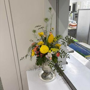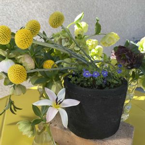 テーブル飾りもつくりました リースとお揃い♪ 「雨水」シーズンに合わせてジョウロの器です ユーカリ 細長い葉っぱ ユーカリ 小さい葉っぱ ミモザ 雪柳 グラスペディア ラグラス ドドナエア ニゲラ ノゲイトウ ワイルドオーツ