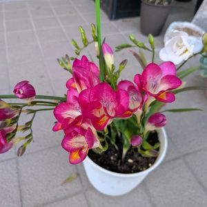 野鼠?の被害に遭ったチューリップ🌷 15個の内、何とか9個、花芽が付きました🥰 僅かになった原種チューリップは花芽を付けませんでした😓 今年は寂しいチューリップの数…😢 4️⃣5️⃣ フリージアも2年目、20個の球根から、芽が出たのは10個、花が咲いたのは紅白2個づつ、咲いてくれました🥰 春は華やか〜〜❤️🤍💛🩷