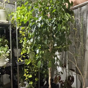 今日のお花 ベンジャミン 過去pic2024/2/1に投稿した写真にいいねをいただき、今日のお花は、ベンジャミンだということに気がつきました。 慌てて、今写真撮って投稿です😅 その過去picは、親株がダメになり、挿し木した子と娘のところのベンジャミンを預かっていた写真でした。 両方とも長いこと植え替えせずにいましたが、娘達が去年春にアメリカから戻ってきて、預かっていたベンジャミンを返そうとしたら、要らないと言われたので、我が家のと娘のベンジャミンを去年春に植え替えて一緒にしたのが、現在の姿です。 3本の木が一つの鉢に植えてあります。天井まで届くほど育っていた親株ほどではないのですが、随分大きくなりました。 室内で年中管理してます🤗