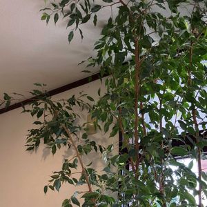 今日のお花 ベンジャミン 過去pic2024/2/1に投稿した写真にいいねをいただき、今日のお花は、ベンジャミンだということに気がつきました。 慌てて、今写真撮って投稿です😅 その過去picは、親株がダメになり、挿し木した子と娘のところのベンジャミンを預かっていた写真でした。 両方とも長いこと植え替えせずにいましたが、娘達が去年春にアメリカから戻ってきて、預かっていたベンジャミンを返そうとしたら、要らないと言われたので、我が家のと娘のベンジャミンを去年春に植え替えて一緒にしたのが、現在の姿です。 3本の木が一つの鉢に植えてあります。天井まで届くほど育っていた親株ほどではないのですが、随分大きくなりました。 室内で年中管理してます🤗
