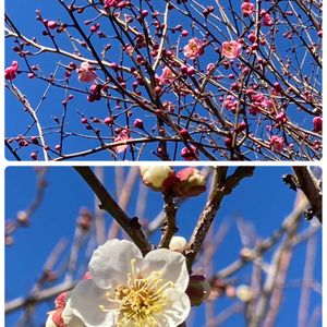 今月もお願いします 🌸花🌼🚶♀️散歩 冷たい風に吹かれながら健気に咲く花🌼🌸達 ① ⬇️白梅 ⬆️紅梅 ② ヒメリュウキンカ ③ オオイヌノフグリ ④ ⬇️ビワ ⬆️サザンカ