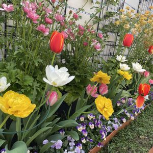 八重チューリップ ピンクと比べて、白と黄ははやい時間から開いてます👀そして夕方閉じるのも遅い。不思議。 アナベルの芽が緑になってました🌱