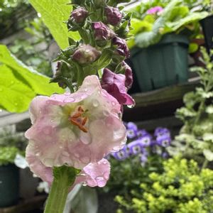 クリスマスローズの葉っぱに隠れてたバーバスカム 開花してた🩷 もう二株あったけど、いつの間にか消えてしまった💦 ここは環境がよいみたいですね