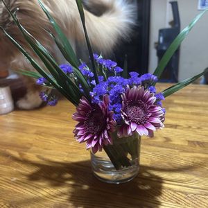 今日のアレンジメントです。 仏壇用だよ。 後ろに尻尾がついてます。 結構アンティークなガーベラです。