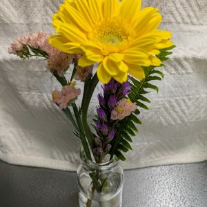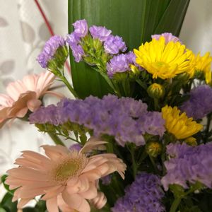 medelu81回目 スターチスは、届いた次の日、ピンクの中に黄色が咲きました。 medeluさんから届くスターチス、よくそんなの入ってます! 黄色いガーベラ?は、2日目に茎が曲がってしまって、他の植物に支えてもらって撮影しました。少し悲しい。ガンバレ!!