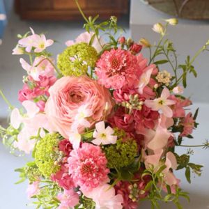 娘が花束をいただいたので花瓶へ 『スカビオサ』が可愛すぎます😍💕 花径約6cmで大きめです🩷 『バラ』は 『旋律』に似た雰囲気 平べったくてロゼット咲き🌹 花径約8cm 良い香りがします🙆 なんだろうなぁ🤔 素敵な花束をありがとうございます😭🌸