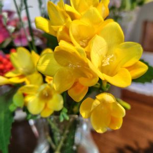 こんばんは🍀 今日のお花🌼フリージア🌼 ①黄色💛 ②ホワイト🤍 どちらも大輪のフリージアです…近くのイケメン君のお花屋さんで買いました〜😉 ③ラックス キュベレー🧡 開花しました ④カレンジュラも沢山咲き出して来た〜🧡 ⑤花首が長かったビオリーナ、この時期に切り詰めはどうかなと思いながらもバッサリ✂️