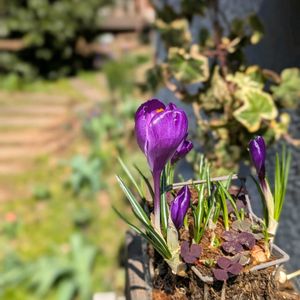 ワイヤー製のカゴに詰めた水苔で育てていたクロッカスがやっと咲きました。