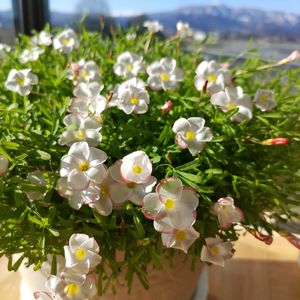 こんにちは~😃 今日は冬晴れ☀ オキザリスもいっぱい開きました🙌 遠~くに見える真っ白の山は月山だよ😊