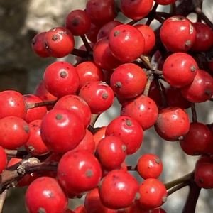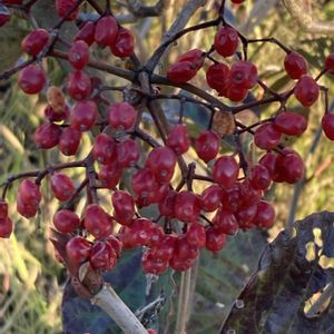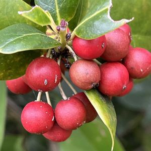 『結合』『私を無視しないで』。「結合」は、小さな白い花が半球状に集まって咲く様子に由来するといわれています。5~6月ごろ花を咲かせます。9~10月ごろに果実が赤く熟し、11月ごろには白い粉がふいて甘くなり、美味しくなります。