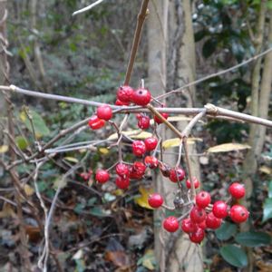 これから野鳥のご馳走になるんですね♪ ガマズミ(莢蒾) ガマズミ科 ガマズミ属 落葉低木 北海道(南西部)、本州、四国、九州に分布 山地、丘陵地、山野の日当たりの良い場所に生育 葉は対生、長さ6〜15cmの円形、卵形、広卵形で縁に細かい鋸歯。 表面は葉脈が出っ張り、デコボコがある。 本年枝先に散房花序を出して、白い小さな花が平頭状に多数咲く。 花は直径約5㎜で、花冠は深く5裂、雄しべは5個。 果実は直径約6㎜の球形で、赤く熟して食用になる。 花期5〜6月 11月24日撮影 福島県須賀川市