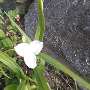 雨上がり 初めて真っ白なツユクサが咲きました🤍 メガネツユクサの変異です🤍 他の子たちが 「あら?お見かけしませんよね」 とおしゃべりしてるのが聴こえてきそうな 今朝の小庭の風景です❇️🫧🌿🫧❇️